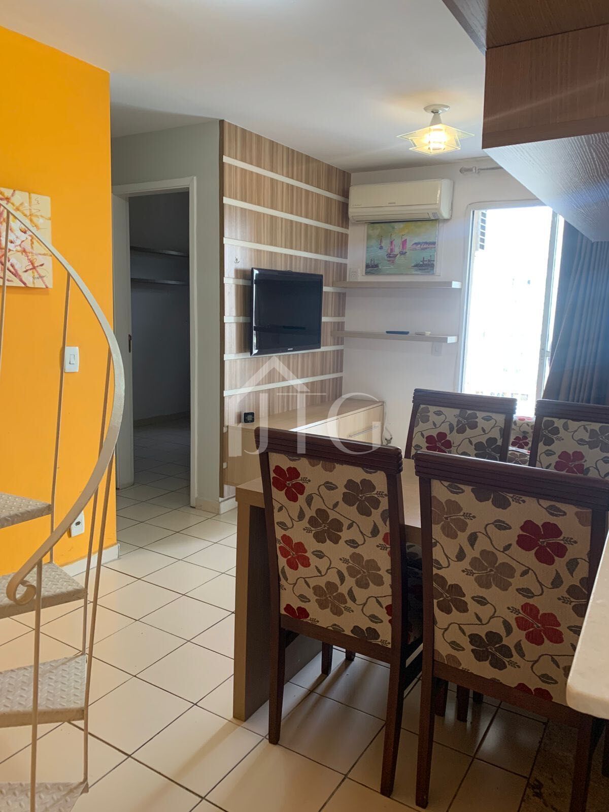 Na parte superior (cobertura), há mais um quarto com cama de casal, armário, TV de 32 polegadas e ar-condicionado Split Samsung, banheiro com armário planejado.