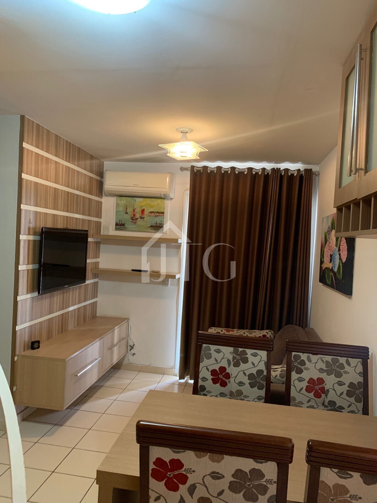 Sala com sofá-cama, rack com TV de 40 polegadas, móvel inferior e ar-condicionado Split Samsung.